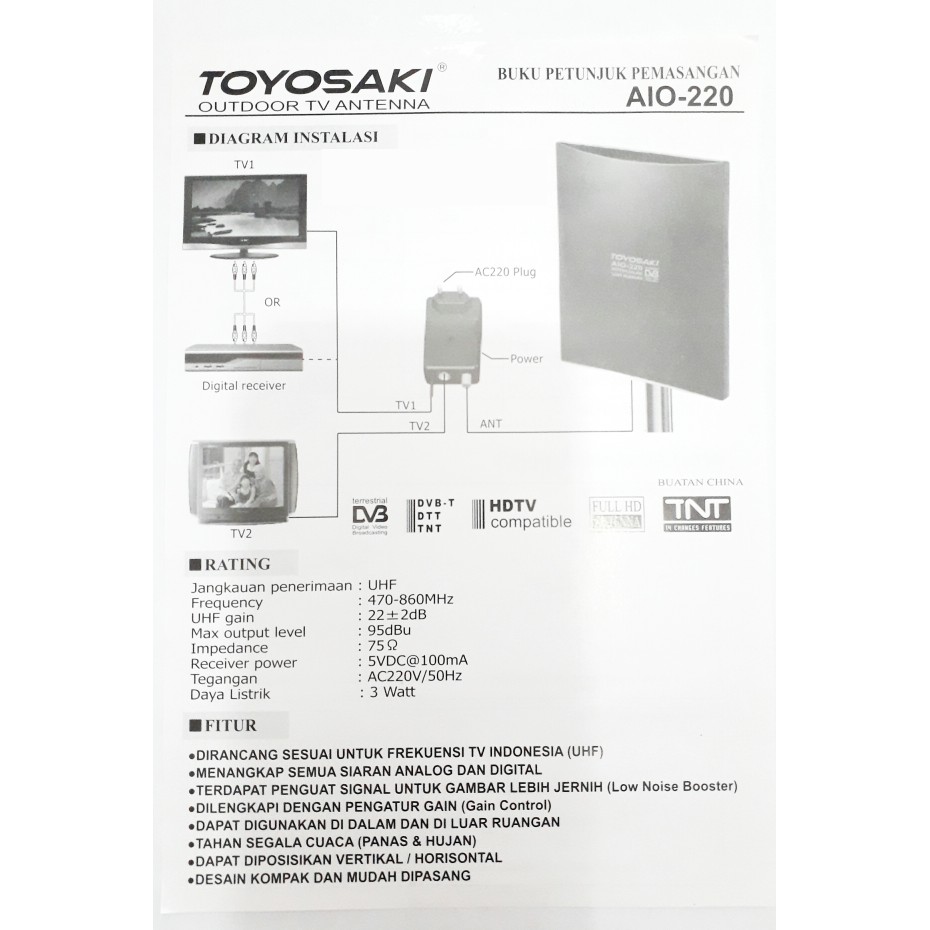 FREE KABEL 10 METER) ANTENA TV DIGITAL TOYOSAKI AIO 220 ANTENA INDOOR OUTDOOR LUAR DALAM | Shopee Indonesia